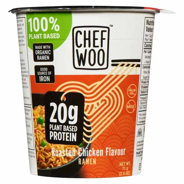 100% plant-based and made with organic ramen noodles, Chef Woo Roasted Chicken Flavor Ramen is a good source of iron and only 20g of plant-based protein.